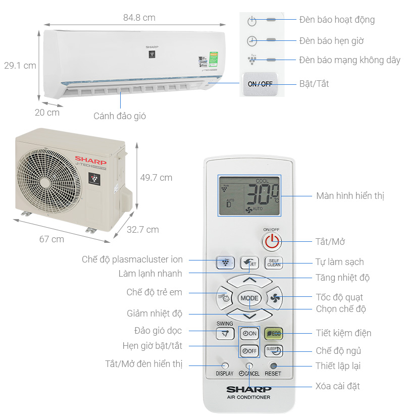 | Kích thước - Khối lượng dàn lạnh | Dài 84.8 cm - Cao 29.1 cm - Dày 20 cm - Nặng 9 kg |