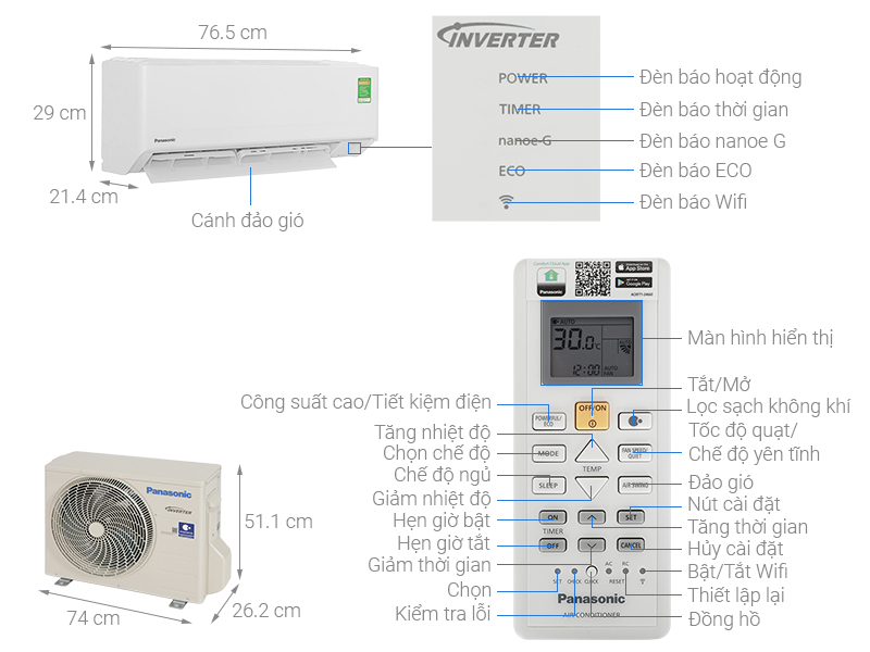Kích thước - Khối lượng dàn nóng: Dài 74 cm - Cao 51.1 cm - Dày 26.2 cm - Nặng 18 kg