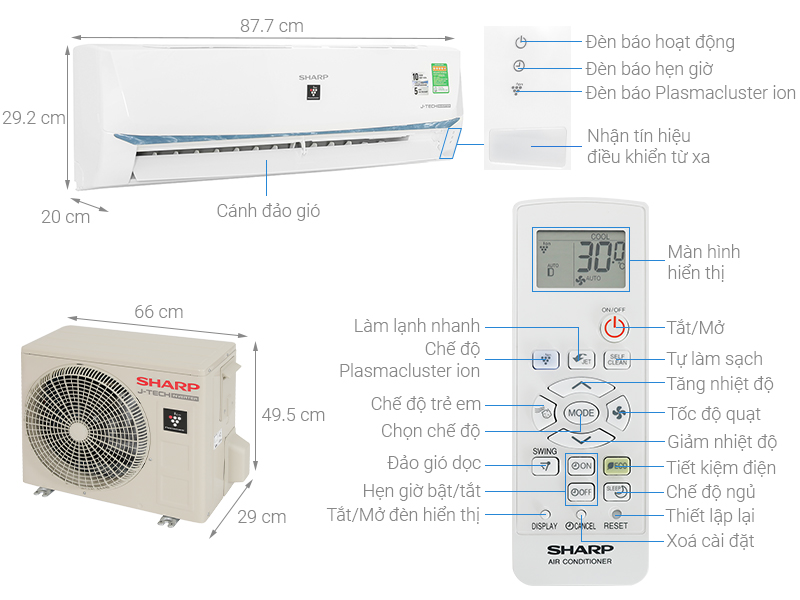| Kích thước - Khối lượng dàn lạnh | Dài 87.7 cm - Cao 29.2 cm - Dày 20 cm - Nặng 10 kg |