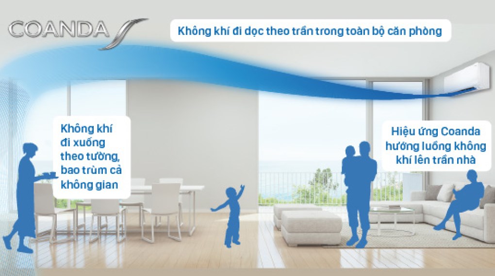 - Đặc biệt là có thiết kế luồng gió Coanda với phần mặt nạ có một góc cong ở miệng gió trên dàn lạnh nên hơi lạnh phả ra sẽ được đẩy lên trần nhà rồi nhịp nhàng tỏa xuống, bao phủ toàn bộ khắp gian phòng mang đến một không gian dễ chịu.