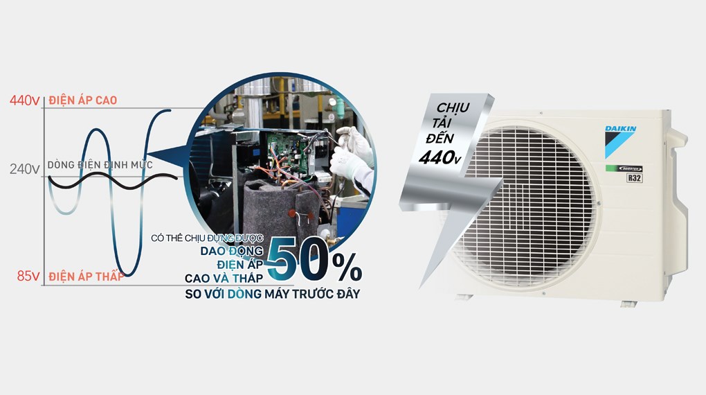 - Trang bị một mạch điện tử chịu được mức điện áp lên đến 440V, cho phép máy vận hành bền ở những vùng có nguồn điện không ổn định mà không phải tốn thêm chi phí cho bộ ổn áp điện. Khi điện áp tăng cao hoặc thấp hơn phạm vi hoạt động của thiết bị, máy lạnh sẽ ngắt điện tự động.