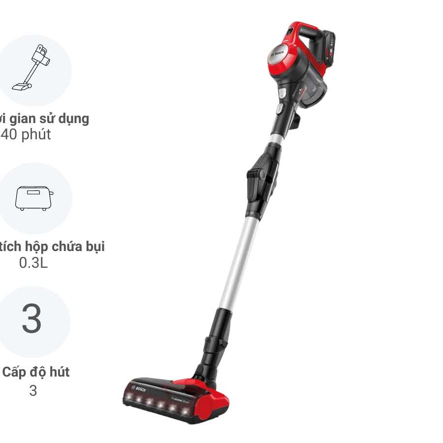 Máy hút bụi Bosch BCS711PET được trang bị pin lithium-ion hiện đại không chỉ thân thiện với môi trường mà còn có tuổi thọ sử dụng lâu hơn pin truyền thống. Pin này có dung lượng 3000mAh, cho thời gian làm việc đến 40 phút tùy theo công suất hoạt động. Với thời lượng này, bạn có thể dọn dẹp diện tích lên tới 100m2 chỉ với một lần sạc pin, giúp việc dọn dẹp không bị gián đoạn và không phải lo lắng về việc sạc lại tốn thời gian. Và thời gian sạc đầy khoảng 5 giờ.