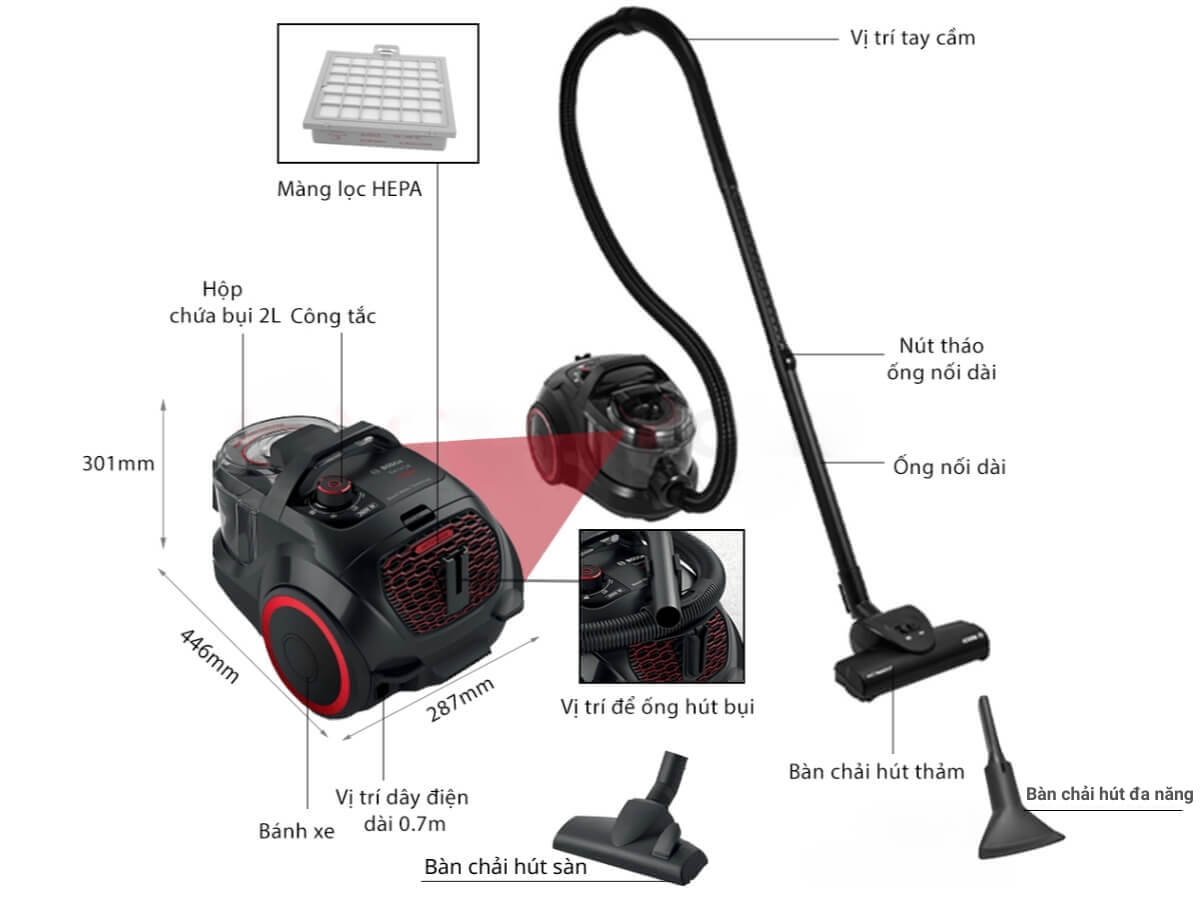 Máy hút bụi Bosch BGS21WPOW là một thiết bị linh hoạt và hiệu quả, cung cấp nhiều đầu hút khác nhau để đáp ứng nhu cầu làm sạch trên nhiều bề mặt khác nhau.