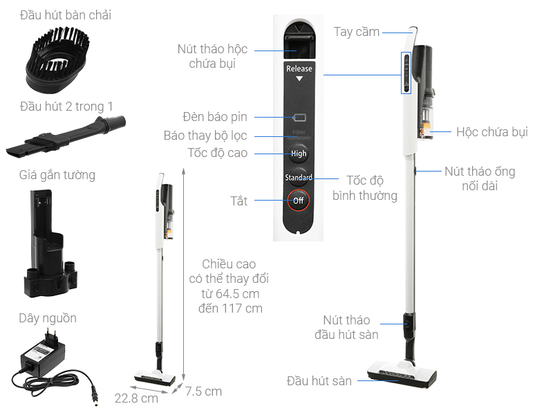 | Tiện ích | Đèn LED chiếu sáng, Đèn chỉ báo pin, Đèn báo thay bộ lọc, Dụng cụ chứa phụ kiện, Điều chỉnh sức hút bụi, Thiết kế 2 trong 1 (có thể tháo rời khỏi ống nối/thân máy) |