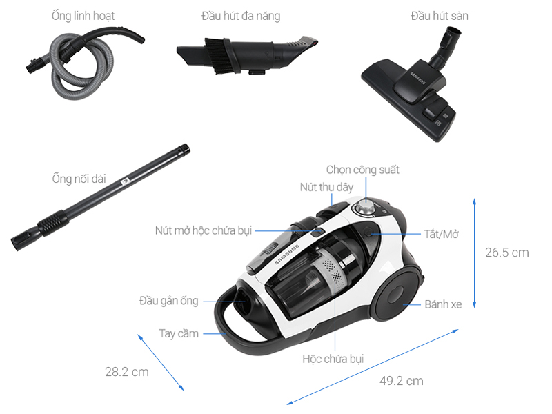 | Kích thước - Khối lượng | Ngang 28.2 cm - Cao 26.5 cm - Sâu 49.2 cm - Nặng 6 kg |