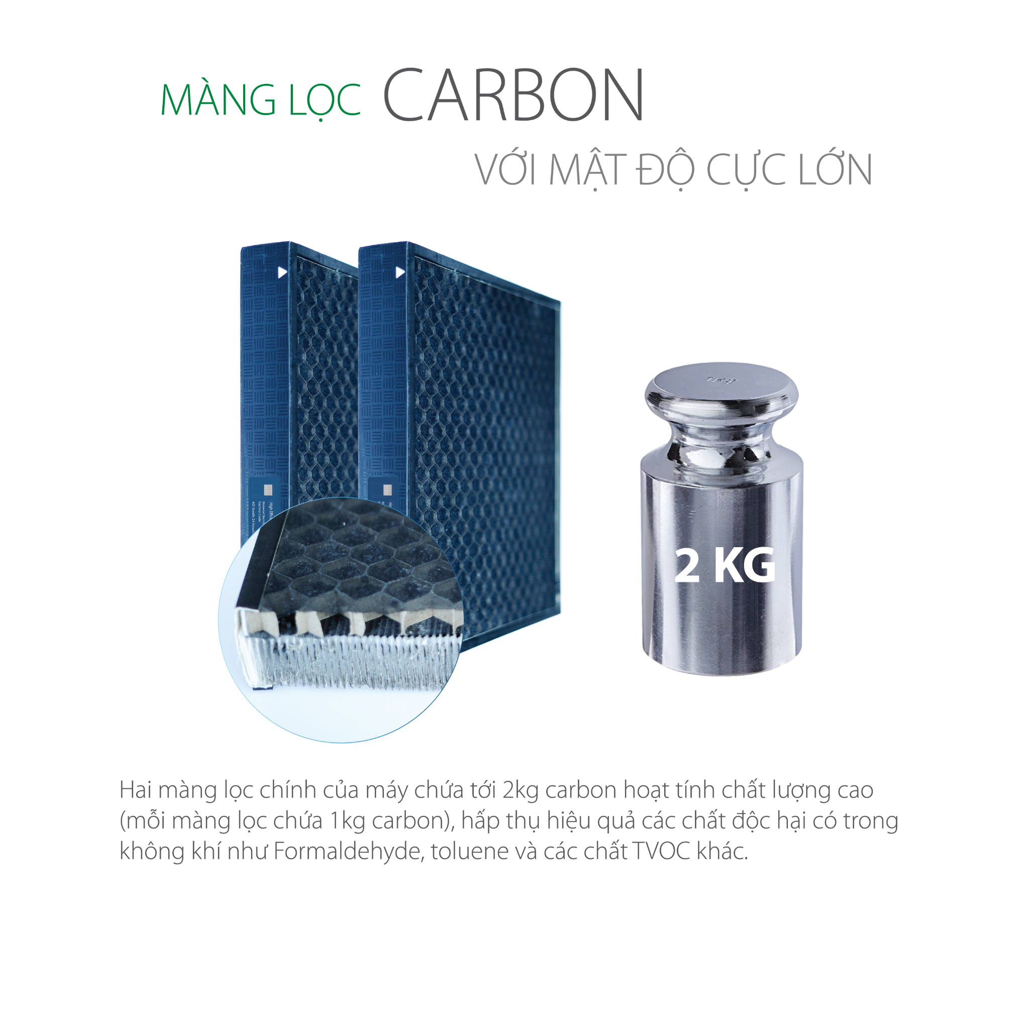 - 2 MÀNG LỌC CARBON HOẠT TÍNH: Loại bỏ TVOC, Toluene, Fomanđêhít, các mùi độc hại từ vật dụng trong gia đình như đồ gỗ, sơn, mùn cưa, vải...