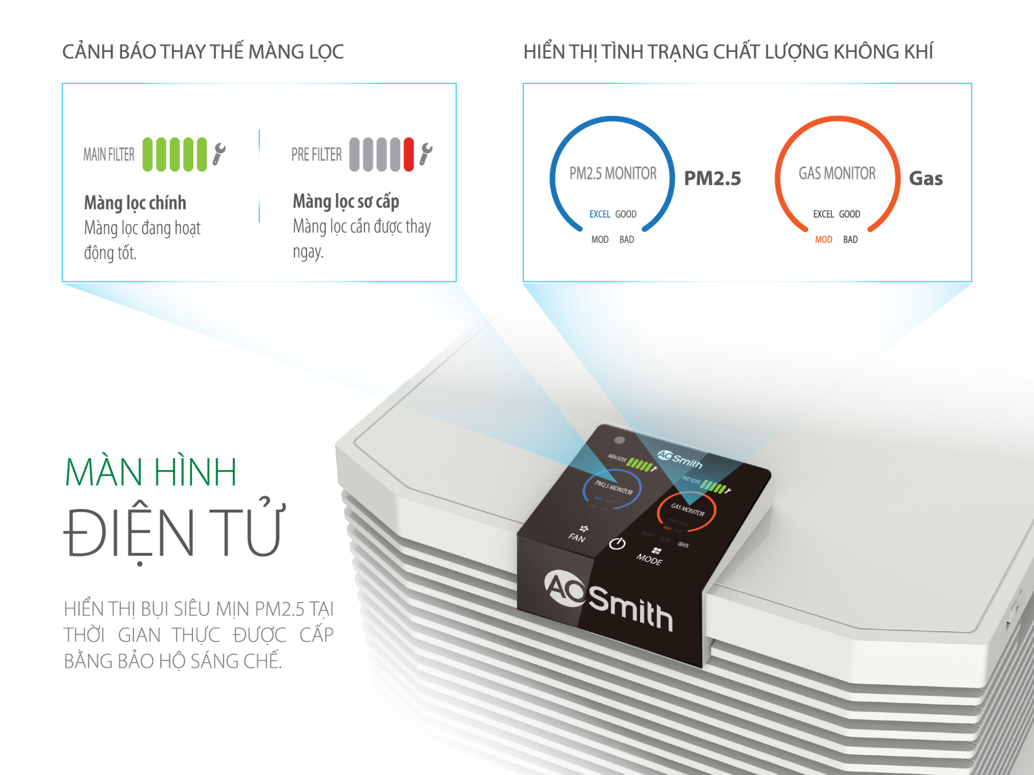 Màn hình cảnh báo hiển thị mật độ bụi PM2.5 trong không khí tại thời gian thực được cấp bằng bảo hộ sáng chế và cảnh báo thay thế màng lọc.