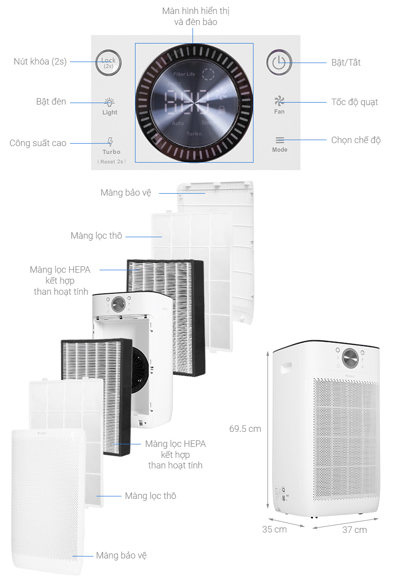| Tính Năng Thông Minh và Tiện Ích | Cảm biến bụi, chức năng ghi nhớ thông minh, đèn báo chất lượng không khí, cảnh báo thay bộ lọc, đèn báo hoạt động, khóa bảng điều khiển |