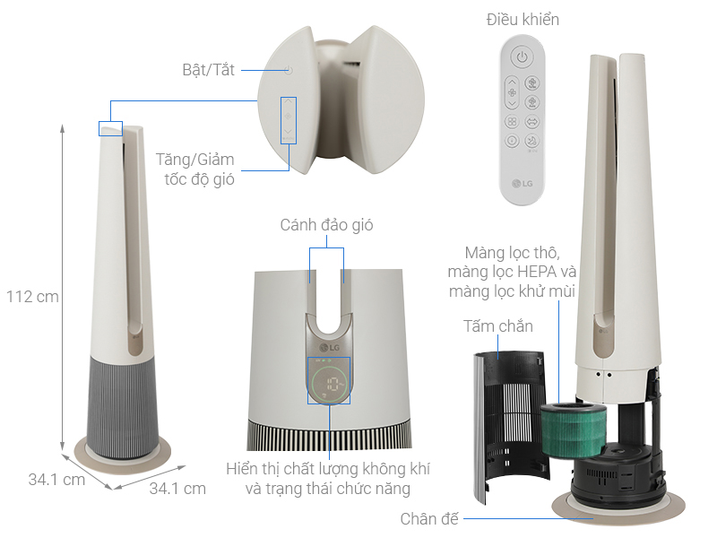 | Tính Năng Thông Minh và Tiện Ích | Cảm biến độ ẩm, khí gas, bụi, mùi, nhiệt độ; ứng dụng LG ThinQ, tạo gió làm mát, diệt khuẩn (đèn UV), điều khiển qua điện thoại và remote, đèn báo chất lượng không khí, cảnh báo thay bộ lọc, hẹn giờ, inverter tiết kiệm điện, đèn báo hoạt động |