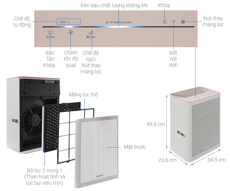 | Tiện Ích | Điều khiển bằng điện thoại qua ứng dụng riêng, đèn báo chất lượng không khí, cảnh báo thay bộ lọc, đèn báo hoạt động, khoá bảng điều khiển |