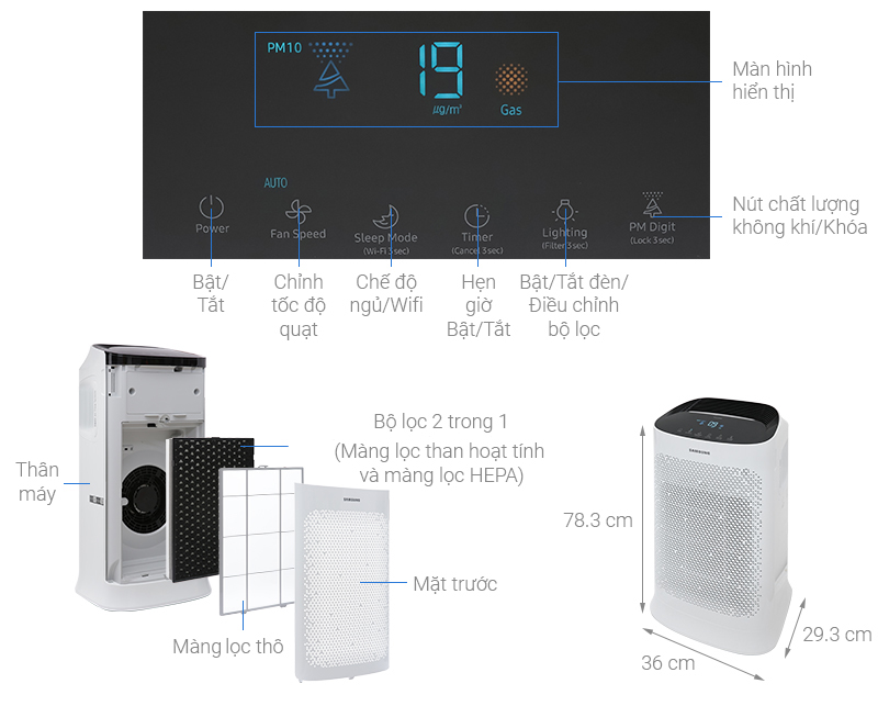 | Tính Năng Thông Minh và Tiện Ích | Cảm biến khí gas, cảm biến bụi, điều khiển qua ứng dụng SmartThings, bánh xe di chuyển, đèn báo chất lượng không khí, cảnh báo thay bộ lọc, hẹn giờ, đèn báo hoạt động, khoá bảng điều khiển |