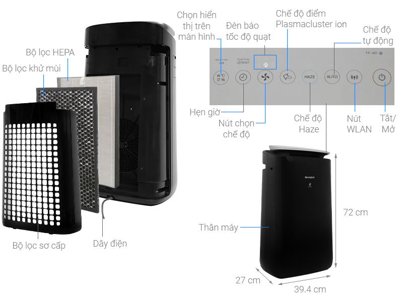 Cảm biến ánh sáng, cảm biến bụi, cảm biến mùi, điều khiển qua ứng dụng Sharp Air App, tính năng diệt khuẩn (ion âm), đèn báo chất lượng không khí, cảnh báo thay bộ lọc, hẹn giờ, Inverter tiết kiệm điện, chế độ tắt đèn hiển thị vào ban đêm, tự khởi động lại, đèn báo hoạt động, khoá bảng điều khiển |