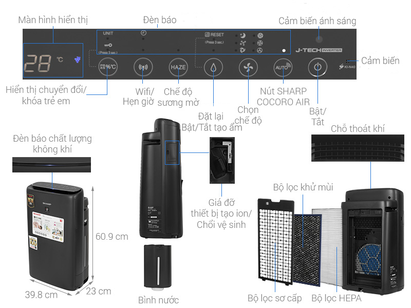 | Tính Năng Thông Minh và Tiện Ích | Cảm biến độ ẩm, cảm biến bụi mịn PM2.5, cảm biến bụi, cảm biến mùi, cảm biến nhiệt độ, cảm biến ánh sáng, điều khiển qua Sharp Air App, tính năng diệt khuẩn (ion âm), tạo độ ẩm không khí, bánh xe di chuyển, đèn báo chất lượng không khí, cảnh báo thay bộ lọc, hẹn giờ, Inverter tiết kiệm điện, khoá bảng điều khiển |