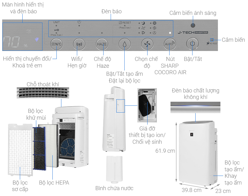 | Tính Năng Thông Minh và Tiện Ích | Cảm biến độ ẩm, cảm biến bụi mịn PM2.5, cảm biến bụi, cảm biến mùi, cảm biến nhiệt độ, cảm biến ánh sáng, điều khiển qua Sharp Air App, tính năng diệt khuẩn (ion âm), tạo độ ẩm không khí, bánh xe di chuyển, đèn báo chất lượng không khí, cảnh báo thay bộ lọc, hẹn giờ, Inverter tiết kiệm điện, khoá bảng điều khiển |