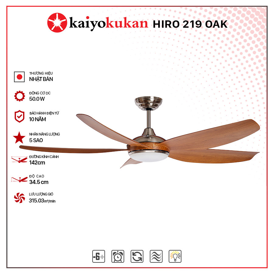 Quạt trần KaiyoKukan HIRO 219 đạt nhãn năng lượng 5 sao được bộ công thương công nhận. Đây là nhãn năng lượng cao nhất, đảm bảo một mức tiêu tốn năng lượng thấp nhất, tiết kiệm cho bạn một số tiền đáng kể trong suốt thời gian sử dụng quạt KaiyoKukan.