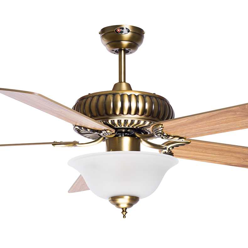 Quạt trần KYO 021 với thiết kế màu đồng cổ mang phong cánh cổ điển, kết hợp giữa đèn chiếu sáng và quạt trần.