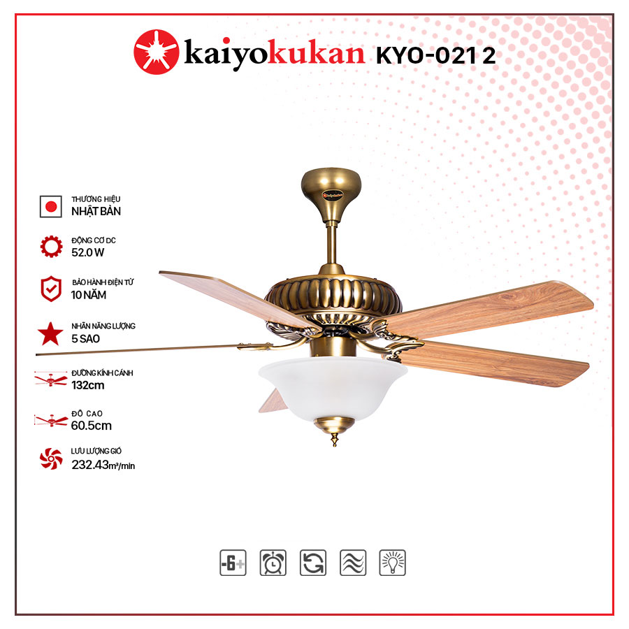 Quạt trần KaiyoKukan kyo 021 đạt nhãn năng lượng 5 sao được bộ công thương công nhận. Đây là nhãn năng lượng cao nhất, đảm bảo một mức tiêu tốn năng lượng thấp nhất, tiết kiệm cho bạn một số tiền đáng kể trong suốt thời gian sử dụng quạt KaiyoKukan.