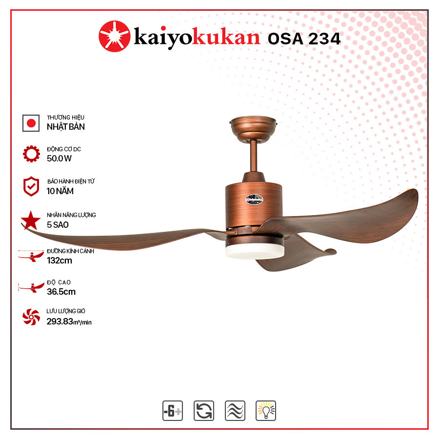 Quạt trần OSA-234 đến từ thương hiệu Kaiyo Nhật Bản với trên 15 năm sản xuất quạt trần và thiết bị chiếu sáng, luôn luôn lắng nghe và đổi mới nhằm đáp ứng nhu cầu của thị trường.