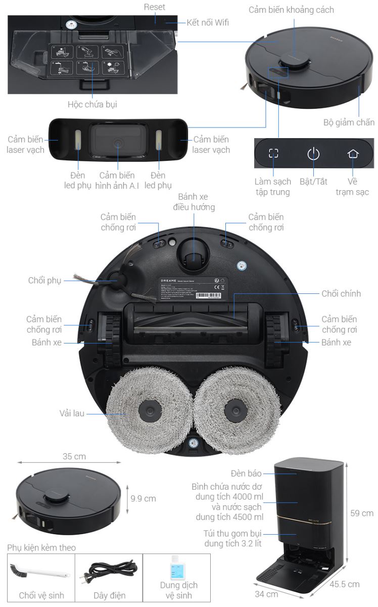 | - Tự động đổ bụi, giặt, sấy khô vải lau | |