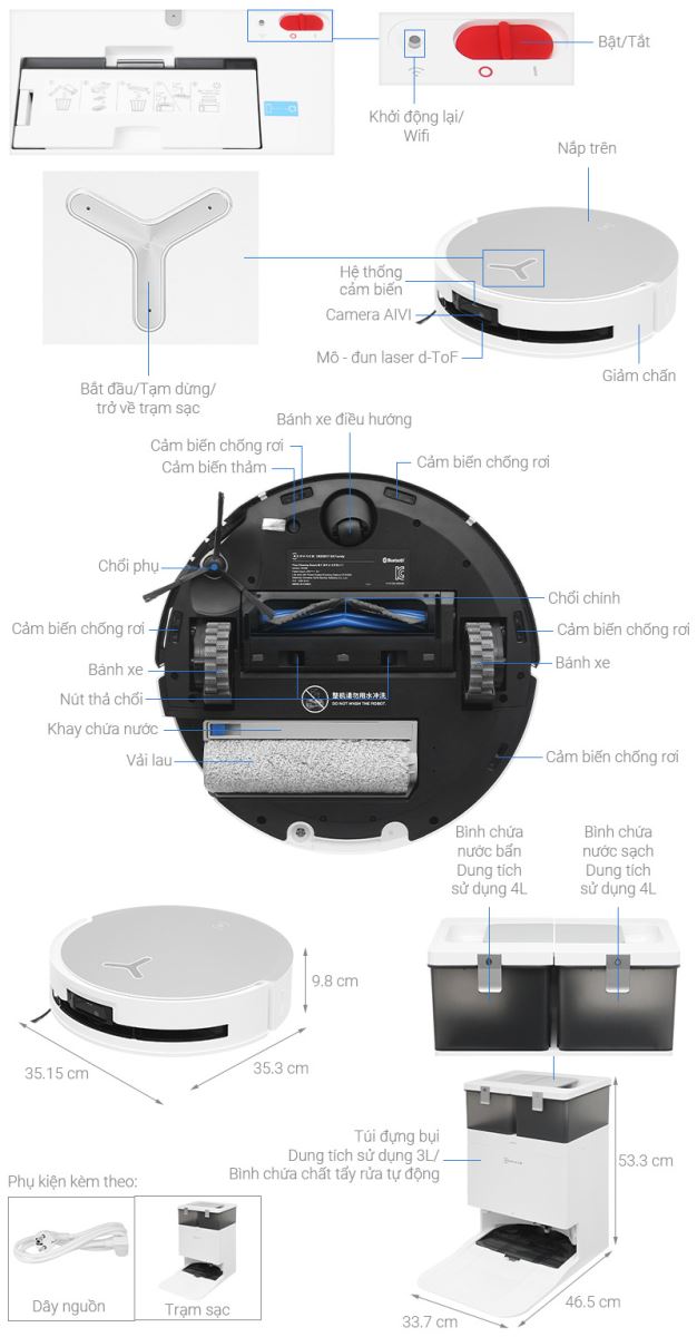 | Tiện ích | - Tự động giặt và sấy khô giẻ lau tại trạm sạc |